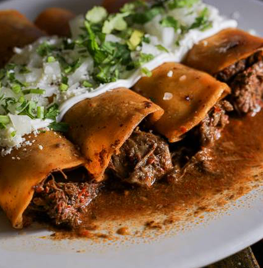Soft enchiladas stuffed with birria and covered in rich sauce, comforting and deeply flavorful.
