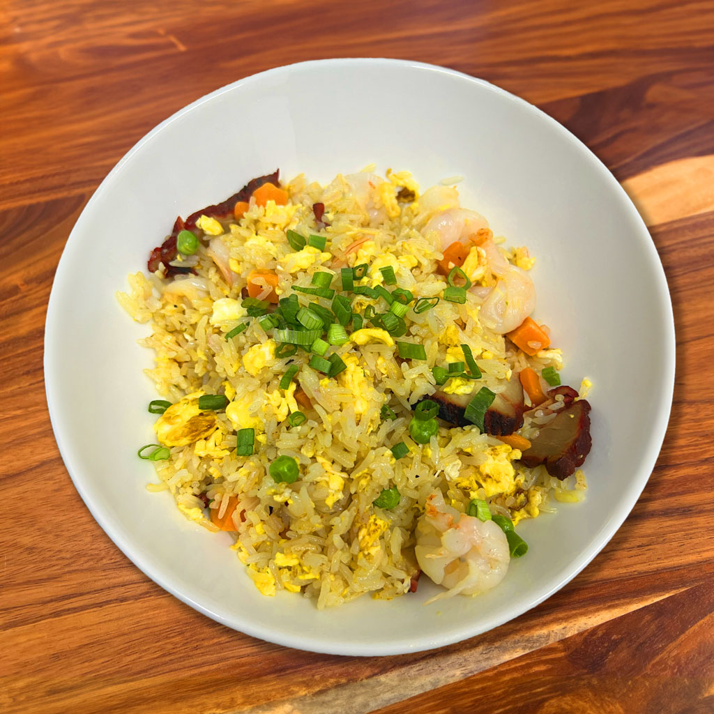Hong Kong style with egg, char siu BBQ pork (50g), shrimp (50g), vegetables