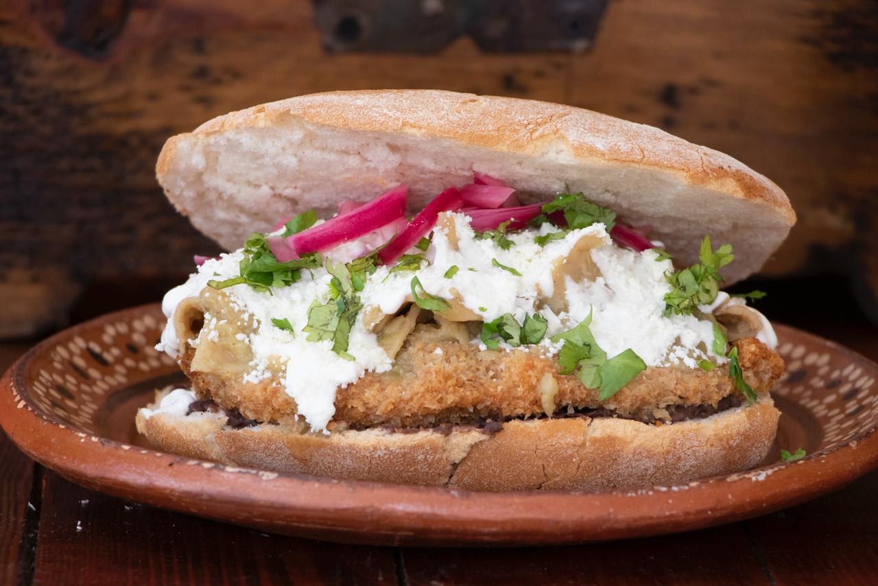 Giant torta with fried breaded chicken breast, with green chilaquiles, cheese, cream, onion and cilantro