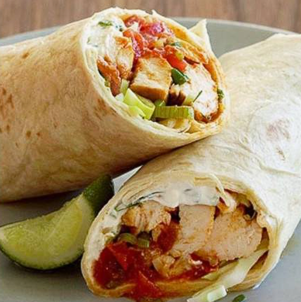 Tender grilled chicken with onion, cilantro, and tomato, wrapped in a warm flour tortilla. A reliable classic.