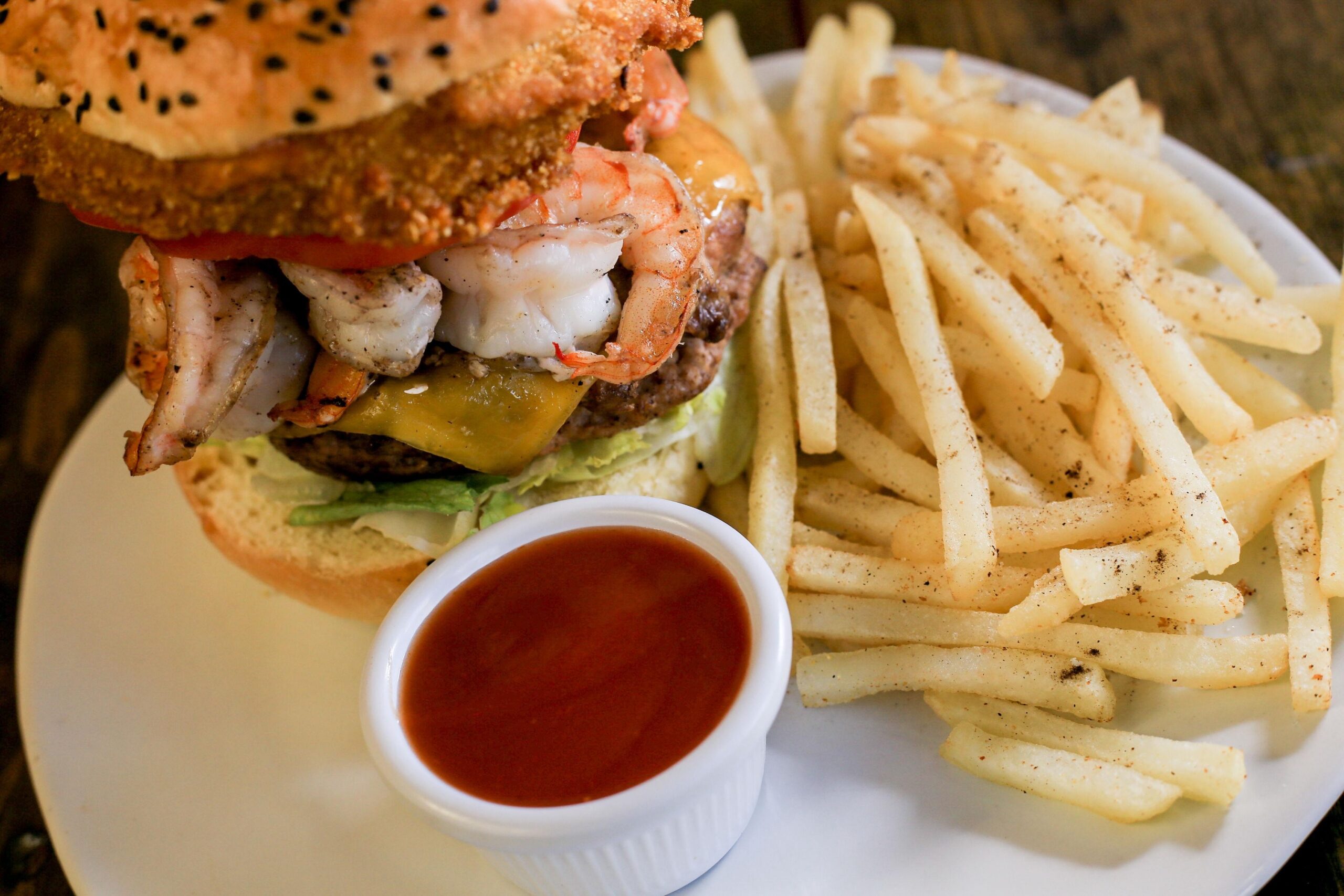 A juicy shrimp burger stacked with grilled shrimp, melted cheese, fresh lettuce and tomato, and finished with a crispy onion ring. Served on a soft sesame bun with seasoned fries and a side of house sauce. Rich, crunchy, and built to satisfy.
