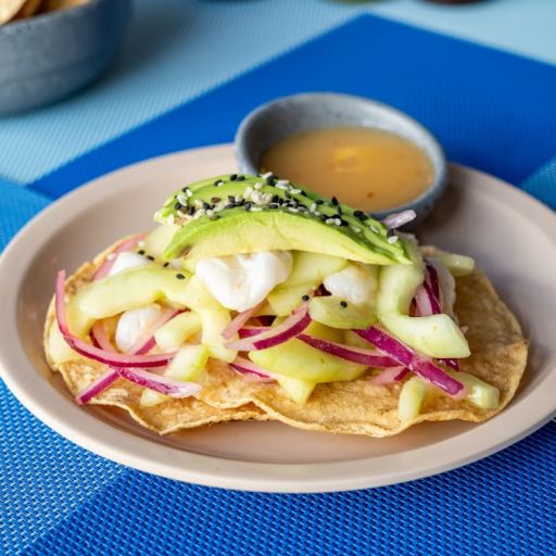 A shrimp aguachile-style tostada.