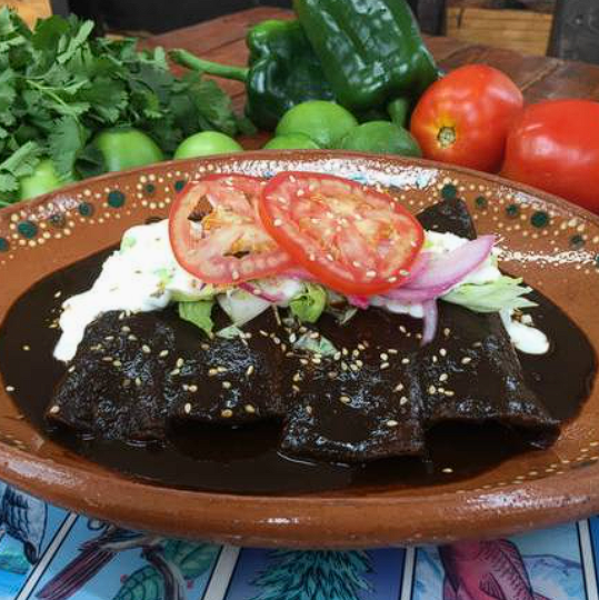 Juicy enchiladas smothered in traditional Mexican mole and topped with fresh lettuce, cream, and cheese. Rich, complex flavor in every bite.