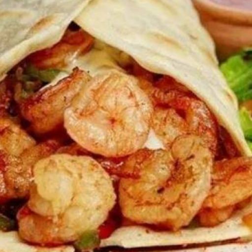 A warm flour tortilla stuffed with seasoned shrimp, fresh vegetables, and melted cheese, grilled until lightly crisp on the outside.
